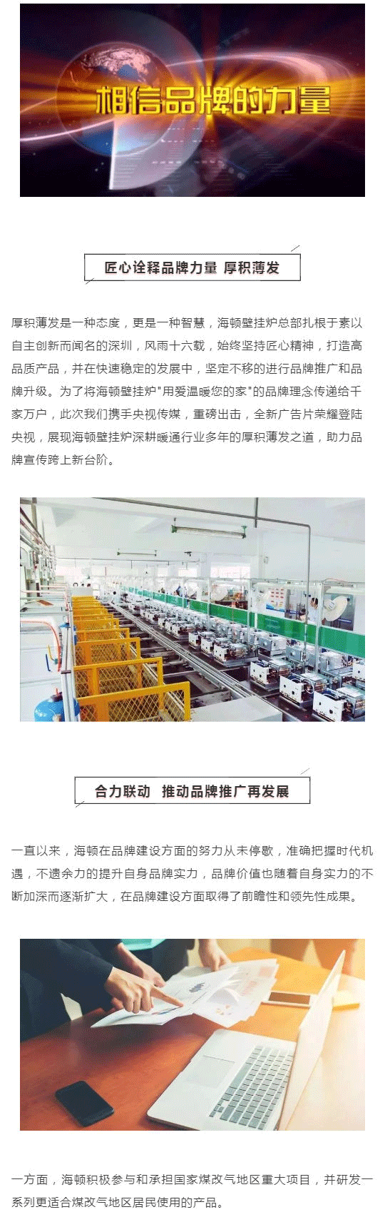 海頓自2003年成立以來,一直將自己定位為高端供暖設(shè)備引領(lǐng)者,為了實現(xiàn)這一目標(biāo)海頓一直努力前行著。近年來暖通行業(yè)的迅猛發(fā)展,國家煤改氣政策大力推行,壁掛爐需求逐步擴大,為了充分把握暖通市場的發(fā)展機遇,海頓進一步遵循“用愛溫暖您的家”的發(fā)展戰(zhàn)略,一方面秉承專業(yè)制造精品的產(chǎn)品理念,持續(xù)加大科技投入,研發(fā)新品,另一方面全面提升品牌實力和影響力,聚勢贏銷,高鐵廣告、央視廣告全面開花,集中打造品牌核心競爭力,讓海頓走進更多消費群體家中。